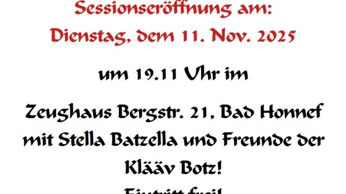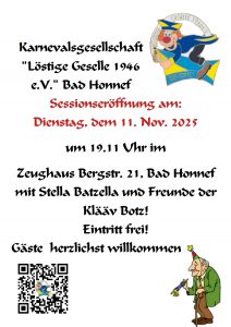 Start in die Session 2025/2026 ist Dienstag, der 11.11.2025 ab 19.11 Uhr im Zeughaus (Uniform). Gäste sind herzlichst willkommen (kein Eintritt).
