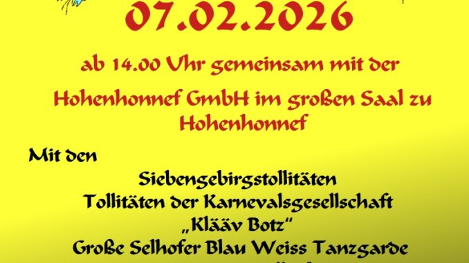 Karneval auf Hohenhonnef (nicht öffentlich) 7. Februar 2026 Peter Monschau 0 Datum/Zeit Date(s) - 07/02/202614:00 - 17:00 Kategorien Karneval
